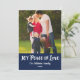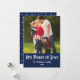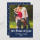 El diseño vertical de la tarjeta fotográfica de vacaciones cuenta con un fondo azul marino (se puede personalizar) y elegantes letras de guiones roscadas "Joy Peace and Love". Personaliza el saludo del personalizado con tu texto preferido y agrega tu foto panorámica favorita (el espacio de la imagen es de 5" cuadrados). En la parte posterior de la tarjeta aparece un patrón de puntos nevados blancos. Fotografía © Storytree Studios, Stanford, CA