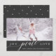 Elegante tarjeta de fotos de vacaciones presenta el guión "Joy Peace Love" sobre el fondo de la impresión de papel gris oscuro y patrón de nieve blanca en la parte posterior. ... Envíe vítores de vacaciones a su familia y amigos. Para una personalización más avanzada de este diseño, pulse el botón "Personalizar".