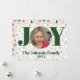 Tarjeta de vacaciones de colores y encanto con la palabra JOY. La O de alegría es una foto. Cerca del final de la tarjeta está tu nombre y el año. La tipografía está en verde. Un diseño divertido y festivo de remolinos rojos y verdes y árboles verdes de Navidad está en la parte delantera y trasera. Una carta deliciosa que traerá alegría a los afortunados destinatarios.
