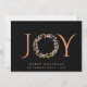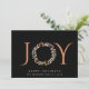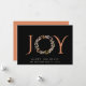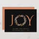 Tarjeta minimalista moderna de bienvenida para Navidades de inspiración boho que incluye la palabra "JOY" en una elegante tipografía de terracota con la "O" representada por una corona acuarela, todo con un fondo negro. Puedes personalizar el saludo de "Felices Fiestas" y tu nombre y el año.