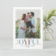 Celebrate the season with this personalized photo Christmas card featuring a large family photo on the front and the word JOYFUL in bold, colorful lettering. You can customize the colors of the letters to match your photo or leave them as is. The back features a vibrant striped pattern in coordinating colors with an extra photo template for more memories. Add your family name and the year on the front to create a one-of-a-kind custom holiday card. This festive photo Christmas card is perfect for sharing holiday greetings, capturing family moments, and sending cheerful wishes to friends and loved ones. Ideal as a colorful Christmas card or family Christmas photo card, it’s a standout holiday photo card that makes every greeting memorable.