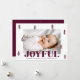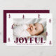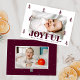 Festividad de la tarjeta de Navidades fotográficos mostrando su foto horizontal rodeada de pinos de color merlot púrpura con fondo blanco. "Alegre" se muestra en negrita con letras merlot-púrpura con el saludo de su personalizado y el nombre de familia que se muestra a continuación. La alegre tarjeta de Navidades se revierte para mostrar una foto adicional y un fondo alegre con sutiles puntos blancos.
