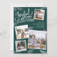 Beautiful typography based holiday photo card features four of your favorite square family photos in a collage layout. "Joyful Wishes" appears at the top in white hand lettered typography on a dark spruce green background accented with white sketched leaves and red holly berries. Customize with your personal greeting, family names and individual names. Cards reverse to a festive holiday plaid pattern in matching hunter green and white.