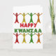 Cuatro bailarinas de danza roja, azul, verde y amarilla entre las palabras "Feliz Kwanzaa" para ayudar a celebrar el sentido de comunidad, familia y nuevos comienzos del año que viene.