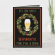 ¡Diseño divertido de Navidad para los bebedores de cerveza! El diseño presenta una corona de Navidad de hojas de acebo y bayas. En el centro de la corona hay un vaso de cerveza. El vaso de cerveza está lleno de cerveza espumosa. En la parte inferior del vaso de cerveza hay un ramito de acebo. Arriba y debajo de la corona hay texto en fuente verde y rojo naranja que dice "¡Es el momento más maravilloso para una cerveza!". El fondo del diseño es negro con borde verde y rojo naranja. El interior de la tarjeta tiene el mismo fondo negro con borde verde y rojo. Hay una foto de una cerveza que se vierte de una botella en un vaso de cerveza. Debajo de la foto hay texto personalizable en fuente gris oscuro y rojo naranja donde puedes dejar el texto como está o personalizar con tu propio saludo de Navidad y tu nombre. ¡P