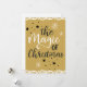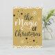 Este diseño de tipografía festiva presenta estrellas negras, copos de nieve blancos y bordes de recortes de paisajes blancos en la parte superior e inferior. Una mezcla de texto en blanco y negro con un sólido fondo dorado, hace de esta una carta elegante y festiva para dar a tus amigos y familia. El texto de la parte posterior es personalizable para que lo edite.