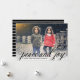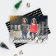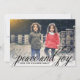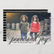 La tarjeta de foto estacional presenta un diseño de escritura caligráfica manuscrita negra "Peace and Joy" con un diseño de superposición con un texto serif moderno y personalizado que puede ser personalizado con el año y su familia / nombre. La parte posterior de la tarjeta incluye rayas horizontales blancas abstractas con un fondo de color negro.