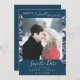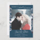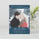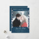Este invierno verde alegre y casi casada salvo la tarjeta de vacaciones de la fecha es el sencillo y perfecto saludo de vacaciones para una pareja comprometida. El diseño moderno se caracteriza por las hojas de acuarela mullidas, con una paleta de colores que recuerda a la primera helada en azul y malva plateado. Personaliza la tarjeta con tu foto de compromiso, nombres, fecha de boda.