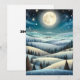 Un sereno paisaje invernal se despliega bajo el resplandor de una luna llena, con colinas onduladas cubiertas de nieve y salpicadas de oscuros árboles de hoja perenne. Las estrellas brillan en el profundo cielo nocturno, añadiendo un toque mágico a la escena pacífica. Este paisaje de fantasía presenta una luna llena que ilumina un campo cubierto de nieve invernal, con colinas, árboles y un cielo lleno de estrellas.