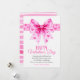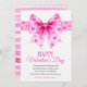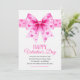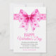 Large pink coquette bow with hearts Happy Valentine's Day card. A vibrant Valentine’s Day card that showcases a bold pink coquette bow adorned with magenta hearts, while the greeting “Happy Valentine’s Day” in a charming mix of script and decorative fonts. A heartfelt poem inside conveys warm wishes for the occasion. The card’s reverse features a playful, mismatched design of pink and white stripes dotted with whimsical hearts.