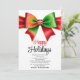 Large red, green bow and stripes Christmas holiday card. The front of the card prominently features an impressive large red and green coquette bow, centered with a delicate snowflake. The cheerful phrase "Happy Holidays" is written in bold script typography. The back reveals an appealing pattern of irregular red and green stripes, playfully scattered with snowflakes.