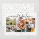 Sencilla tarjeta de vacaciones con 5 fotos y un diseño moderno con un guion caprichoso que dice LAS NAVIDADES MÁS ALEGRES con una conexión de corazón escrita a mano. Espacio para tus 5 fotos familiares favoritas y mensaje. En la parte posterior hay un patrón de puntos minimalista dibujado a mano.