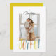 Una tarjeta de vacaciones plana con una foto presenta letras de pincel de acuarela de la palabra "Alegres".