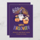Esta tarjeta de Halloween personalizable y adorable presenta un fantasma sonriente que lleva un sombrero de bruja morado, una calabaza con un gato y una tarta de cumpleaños festiva coronada con murciélagos, todo sobre un fondo místico morado. La colorida letra “Feliz Halloween” y el cálido mensaje “Saludos espeluznantes de Bridget y George” la hacen ideal para enviar deseos alegres de Halloween a amigos, niños y familiares.
