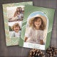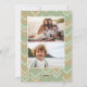 Una moderna tarjeta de fotos de Feliz Navidad en tonos dorados pastel y verdes. Líneas retro curvadas rodean la foto en tonos pastel. La foto de la parte delantera es un arco moderno con un borde blanco. La parte trasera incluye 2 fotos más. El fondo de la espalda es un patrón de arenque boho colorido - una mezcla ecléctica de patrones.