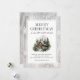 Tarjeta de vacaciones de color acuático rústico con una cabaña de troncos dentro de un marco rústico de madera adornado con copos de nieve. Personalice fácilmente esta nevada tarjeta de vacaciones con su nombre y texto familiar.