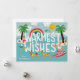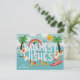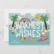 El divertido Santa surfista es arrastrado por sus renos vestidos con trajes de baño en esta divertida tarjeta de vacaciones con tema de playa. También cuenta con las clásicas palmeras de Navidad decoradas y criaturas marinas de temporada.