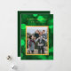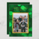 Esta tarjeta de vacaciones fotográfica presenta tu foto y las palabras "Feliz Navidad" en lámina de oro falso sobre un fondo de luces bokeh color verde esmeralda. La tarjeta tiene un reverso con fondo verde oscuro.