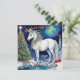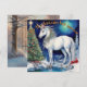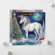 Este encantador diseño presenta un hermoso unicornio blanco con delicadas flores que adornan su melena, colocado contra un sereno cielo nocturno invernal de color azul oscuro estrellado en el lejano norte. Majestuosas montañas y un abeto espléndidamente decorado completan la escena, creando una atmósfera verdaderamente mágica y emotiva. Personaliza la mayor parte del texto y celebra el espíritu de la temporada navideña con esta cautivadora obra de arte que captura la magia de las noches de invierno.