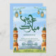 Featuring towering minarets under a bright blue sky, this card offers a grand and uplifting perspective. The watercolor textures and hanging lanterns create a festive and airy atmosphere.