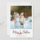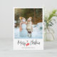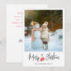 Tarjeta de vacaciones de Navidad moderna con una foto grande, letra de caligrafía, manoplas rojas y mensaje personalizado.