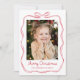 Envía alegría festiva con esta fantástica tarjeta navideña de fotos de marco rojo de arco de mano 2. La parte frontal muestra la foto enmarcada por una cinta roja dibujada a mano con un arco en la parte superior para una simple pero encantadora apariencia navideña. "Feliz Navidad" se muestra en un guión rojo escrito a mano, con el nombre de su familia impreso debajo. En la parte posterior, agregue una segunda foto junto con su mensaje de vacaciones personalizado, haciendo de esto una tarjeta de Navidades alegre y memorable.