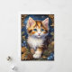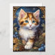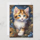 Tarjeta de vacaciones con un lindo gato calico esponjoso posando en un marco dorado decorativo adornado con piñas y follaje invernal, bajo un cielo nocturno estrellado. 'Felices Fiestas' en la parte posterior se puede personalizar o dejar en blanco para un mensaje escrito a mano.