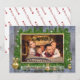 Una atractiva y atractiva tarjeta de Navidades con la foto de tu familia realzada por un glamoroso marco dorado sobre una masa de pino y fondo de madera templada. Tu texto en la parte inferior de un Navidad rojo fácil de leer sobre un cartel de pantalla.