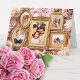 Galería de Marcos de Memoria Florales Barrocos en Oro Suave presenta una composición visual ricamente estratificada de marcos barrocos ornamentados rodeados de arreglos florales exuberantes en tonos suaves de rosa, marfil y champán cálido. Rosas esculpidas, pétalos delicados y sutiles acentos botánicos se entrelazan orgánicamente alrededor de elegantes marcos dorados, creando un ritmo visual refinado que se siente atemporal y sentimental. Destellos suaves y sombreado matizado añaden profundidad y dimensión, mientras que la disposición equilibrada mantiene la imaginería enmarcada y un área de inscripción central visualmente armoniosa y naturalmente enfatizada.