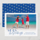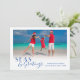 Desde la Navidad en la playa hasta sus vacaciones costeras favoritas, esta tarjeta de “Mares & Saludos” es una forma genial de desear a amigos y familiares una Feliz Navidad tropical. Cuenta con su foto de playa favorita, saludo personalizado y nombre. La parte trasera de la tarjeta tiene un divertido patrón de estrellas de mar.