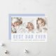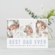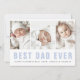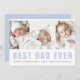 Tarjeta del día del padre con tres fotos personalizadas y texto con fuente moderna en azul claro "Mejor papá del mundo" con tu mensaje debajo en la parte delantera. Parte trasera en azul claro o color personalizado. Cambia colores y fuentes, mueve y redimensiona elementos en la herramienta de diseño.