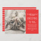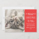 Una tarjeta perfecta para presumir de su nuevo gatito de cuarentena o de su mejor amigo peludo! Esta divertida tarjeta de fotos con temas de gatitos "Navidades Meowy para ti" incluye una foto de tu bebé junto a texto escrito a mano y texto personalizado que puedes personalizar con un simple mensaje de vacaciones de deseos cálidos y acogedores, el nombre de tu gato y tu apellido / familia. El diseño moderno y minimalista incluye un fondo rojo naranja festivo y whiskys blancos y acentos cardíacos. Un patrón de franjas horizontales blancas abstractas se viste por la parte posterior de la tarjeta.