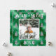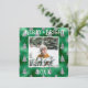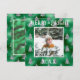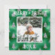Tipografía Merry & Bright. Verde falso metálico con árboles de pino con brillo plateado y tu foto favorita en el centro. Personaliza con tu mensaje y nombre en el reverso. La tarjeta de felicitación perfecta para las fiestas.
