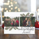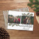 Usar dos fotos horizontales con el tema centrado. Haga un exclusivo y moderno saludo de Feliz Navidad con ramas de pino extravagantes en la parte delantera y un patrón de rayas dibujadas a mano en la parte trasera. Si necesita mover algo, haga clic en el botón personalizar para realizar cambios. Foto: Photography © Storytree Studios, Stanford, CA.