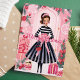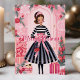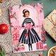 Envíe elegantes saludos de vacaciones con esta tarjeta de moda que incluye una muñeca de moda vestida con un hermoso traje de vacaciones. Rodeada de decoraciones y regalos festivos, esta tarjeta es perfecta para los amantes de la moda que aprecian un diseño único y glamoroso de Navidades.