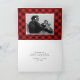 Envíe saludos de vacaciones a la familia y amigos con esta linda tarjeta de saludo de fotos de Feliz Navidad. La tarjeta de vacaciones doblada muestra tu foto horizontal favorita de sangrado completo con "Feliz Navidad" en una sobreimpresión de escritura blanca con letras a mano. Personalice la parte delantera de la tarjeta fotográfica de vacaciones agregando su nombre y el año. En el interior de la tarjeta hay espacio para una segunda foto con un fondo de acuarela rojo y negro y el saludo de su personalizado que se muestra a continuación.