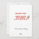 Esta tarjeta de felicitación de 19 navidades, cuestionablemente alegre, muestra a un patógeno sars-ncov-2 vestido con luces retro de jilguero de Navidad y con una máscara en la parte delantera, con el texto "MERRY CHRISTMASK" (editable) . La parte de atrás dice "¡MÁSCARSE! ¡Y AHORRENOS ALGUNAS COOKIES!" (también editable), junto a una galleta de pan de jengibre, también con una máscara. Debajo hay un tipo de letra escrito a mano en negro para que incluyas tu nombre / firma