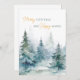 Watercolor winter trees in shades of green paired with script and modern typography holiday card.