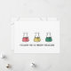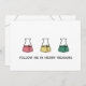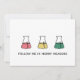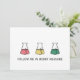 Tres frascos de Erlenmeyer con diferentes soluciones coloreadas hacen que esta tarjeta de vacaciones sea apta para un químico. Hay tres burbujas en la parte de atrás. El texto en la parte frontal dice "Sígueme en medida de cereza" - el texto editable en la parte posterior dice "¡Felices vacaciones!" Profesores y científicos apreciarán este sentimiento mientras levantan sus vidrios para brindar por la temporada de Navidades.