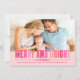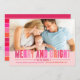 ¡Esta tarjeta de fotos es colorida, moda y llena de alegría! Presenta un moderno tipo "Merry and Bright Wishes" en colores rojo, rosa y blanco, texto personalizado para que usted pueda personalizar su saludo de vacaciones, amplio espacio para mostrar una foto de paisaje, y audaces rayas horizontales acentuan el dorso.