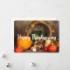 Una tarjeta plana con una fotografía de una cosecha de acción de gracias, puesta en una mesa de madera rústica. Calabaza, patatas, calabacines, etc... componen esta abundante colección de alimentos. Coloridas hojas de otoño rodean la cesta de la cornucopia.