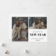Una tarjeta blanca simple y Minimalista de vacaciones con texto negro y negrita que dice "Feliz Año Nuevo" y dos fotos (foto vertical y horizontal) también puedes personalizar tu mensaje en la parte posterior de la tarjeta.