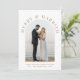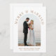 invitación de boda blanco moda y tarjeta de vacaciones de Navidades para recién casados que presenta su foto en un marco de arco, "Merry & Married" en elegante tipografía serif blanca, y su saludo de vacaciones, nombre casado y el año en una simple y moderna tipografía de oro.