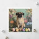 Cute pug Postal botánica de Pascua. Imagen de estilo rústico de un perro de cerdo con huevos de Pascua y botánicos florales.