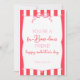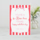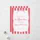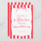 El diseño muestra un borde de rayas rosas y blancas con un marco central de vieiras, acentuado por un arco rosa decorativo en la parte superior. Su alegre paleta de colores rosa y blanco, combinada con una mezcla de estilos y tamaños de fuente, crea una composición divertida y elegante.
