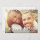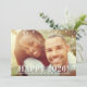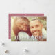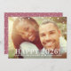 La moderna tarjeta fotográfica de Año Nuevo ofrece tu foto horizontal favorita con el diseño de texto "Happy 2024!" con texto personalizado y confeti con forma de borde. Personalice con un mensaje personalizado y sus nombres o apellidos. En la parte posterior de la tarjeta se muestra un color de fondo morado impreso en forma de cassis (se puede modificar) con un patrón de confeti coordinado.