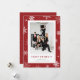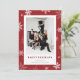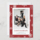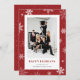 Foto de color rojo moderno Tarjeta Feliz feriado con copos de nieve en un fondo rojo claro. Personalice fácilmente esta tarjeta de vacaciones de fotos de negocios con su foto y nombre de empresa.
