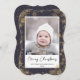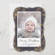 Moderno Blue Elegant Script Snowflakes Bokeh Tarjeta Minimalista de vacaciones. ¡Envíe personalizable y saludos personalizados de vacaciones a amigos, colegas y familia en simples, minimalistas, elegantes, divertidas, festivas y modernas tarjetas fotográficas! Una hermosa imagen de una variedad de copos de nieve dorados de invierno sobre un fondo verde salado rodea tu foto. El saludo " Feliz Navidad " está escrito en caligrafía elegante, y debajo se muestra el mensaje de bienvenida de su personalizado de nombre familiar en tipografía moderna. Invertir para revelar una hermosa imagen de los copos de nieve de invierno dorados sobre fondo verde sabio.
