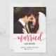 Elegante tarjeta fotográfica de vacaciones "Casados y Cerezas" para recién casados presenta un retrato del día de la boda, texto rojo y negro personalizado que puede ser personalizado con nombres y fecha boda. Un pequeño corazón rojo acentúa la parte delantera y un audaz patrón blanco y negro de rayas horizontales se viste por la parte posterior.