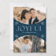 ¡Desee a los seres queridos una feliz temporada de vacaciones enviándoles una tarjeta de vacaciones de moda diseñada por Late Bloom Paperie! La única tarjeta de vacaciones incluye dos fotos dentro de un marco de foto de arco oval de la marina. "Alegre" se exhibe con letras blancas modernas acentuadas por copos de nieve dibujados a mano. Personalice la parte delantera de la tarjeta de fotos de Navidad agregando su nombre. La parte posterior de la tarjeta de vacaciones multifoto muestra un patrón de copos de nieve marina.